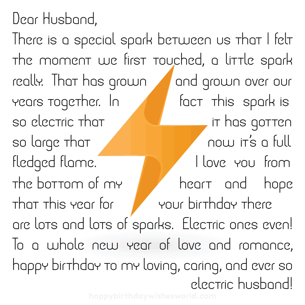 Dear Husband, there is a special spark between us that I felt the moment we first touched, a little spark really. That has grown and grown over our years together. In fact this park is so electric that it has gotten so large that now it’s a full fledged flame. I love you from the bottom of my heart and hope that this year for your birthday there are lots and lots of sparks. Electric ones even! To a whole new year of love and romance, happy birthday to my loving, caring, and ever so electric husband!